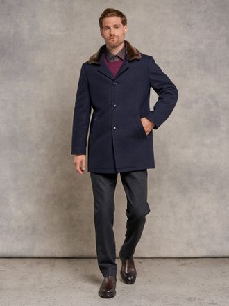 Утепленное пальто полуприлегающего силуэта из фактурной шерстяной ткани высокого качества.